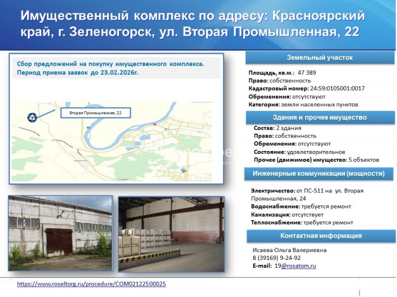 АО «ПО ЭХЗ» продает имущественный комплекс по адресу: Красноярский край, г. Зеленогорск,