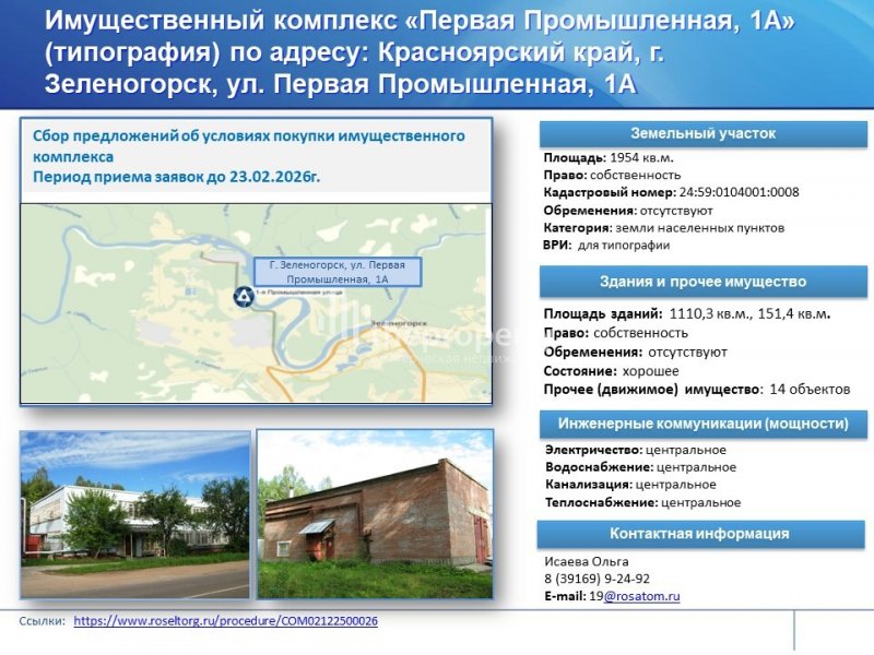 Объявлена процедура сбора предложений на покупку имущественного комплекса (производственного назначения) по адресу: Красноярский край, г. Зеленогорск, ул. Первая Промышленная, 1А