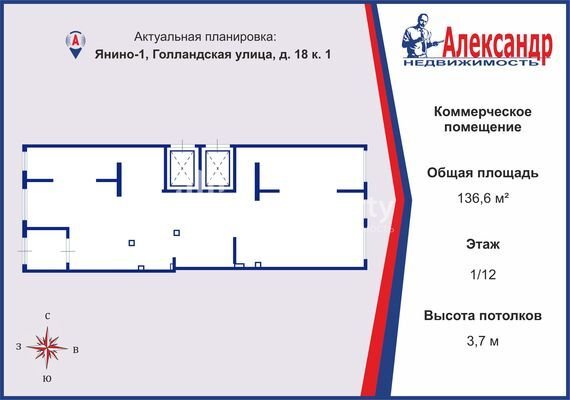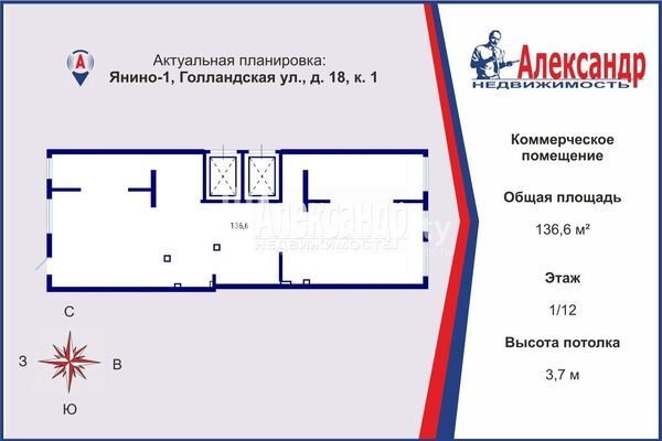 1701894 В аренду фасадное нежилое помещение площадью 136,6 квадратных метров с отдельным входом! Предлагаем вашему вниманию просторное коммерческое помещение на первом этаже нового жилого комплекса первая очередь которого сдалась в эксплуатацию в конце 2023 года. В комплексе располагается всего более 1500 квартир, что обеспечит высокий поток клиентов. Самое коммерческое помещение расположено в уже построенном доме, в котором завершается заселение. Характеристики помещения: - площадь: 136,6 кв.м; - высота потолков: 3,7 м; - электрическая мощность: 27 кВт/ч; - возможность обустройства санузлов; - подводы: горячая и холодная вода, канализация, отопление; - большие витринные окна для отличной видимости. Комфортный безбарьерный вход и удобная парковка прямо напротив. Цена: в первый год — тысяча четыреста рублей за кв.м, с дальнейшим увеличением. Гибкие условия сотрудничества, возможность обсуждения арендных каникул. Это помещение идеально подойдет для магазина, кафе, салона красоты, аптеки или офиса. Высокие потолки и открытая планировка позволять реализовать максимально универсальные бизнес-задачи. Не упустите шанс стать владельцем коммерческого помещения в одном из перспективных районов поселка Янино-1 Ленинградской области! Звоните, отвечу на вопросу и организую просмотр!