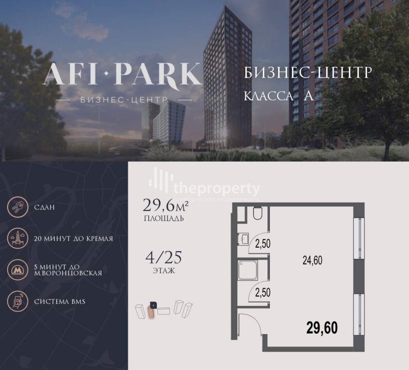 Продается просторное коммерческое помещение общей площадью 29,6 на 4 этаже в готовом бизнес-центре AFI Park. Строительство комплекса завершено. 21-этажный бизнес-центр AFI Park - современный бизнес-центр класса A с мультифункциональной экосистемой для бизнеса, панорамным остеклением и эргономичным пространством станет завершающим этапом клубного квартала. На первом этаже здания - лобби с комфортной зоной ожидания, кофе-поинтами и банкоматами, ресторан и торговая зона. Со второго этажа располагаются офисные помещения, формат которых предусматривает «нарезку» по желанию арендатора. Эргономичные openspace-планировки дают возможность организовать на каждом этаже функциональные рабочие зоны, переговорные комнаты, кабинеты руководителей, конференц-зал, бизнес-гостиные и зоны отдыха. За счет неглубокой посадки офисов и панорамного остекления все помещения хорошо освещаются естественным образом. Из окон открывается панорамный вид на город и Воронцовский парк, а высокие потолки и остекление «в пол» наполняют офисное пространство дополнительным воздухом и светом. Инфраструктура бизнес-центра создана с учетом ежедневных потребностей офисных резидентов. У входа расположена зона для посадки в такси и 11 гостевых машино-мест. В подземной части находится паркинг на 44 машино-места. На первом этаже - лобби с комфортной зоной ожидания, кофе-поинтами и банкоматами, ресторан и торговое пространство с сервисами быта. Здание оснащено централизованной системой автоматизации и управления, гарантирующей высокие стандарты контроля доступа и уровень комфорта. Принудительная приточно-вытяжная система вентиляции с подогревом и рециркуляцией воздуха, мультизональная система кондиционирования VRV, система освещения, пожарной сигнализации, управления высокоскоростными пассажирскими и грузовыми лифтами BLT, все контролируется диспетчером в автоматическом режиме через Building Management System, исключая человеческий фактор и неожиданные сбои. Круглосуточная охрана и видеонаблюдение внутри и по периметру здания позволяют эксплуатирующей компании в любое время заботиться о бизнес-центре, его резидентах и гостях, а консьерж-сервис окажет необходимые услуги по запросу резидентов в пределах здания. Стратегическое расположение между Ленинским проспектом и улицей Профсоюзной, на пересечении Старокалужского шоссе с улицей Академика Челомея обеспечивает удобную логистику на наземном транспорте, а пешая доступность станции метро БКЛ «Воронцовская» подключает локацию практически к любому району Москвы. [#7698846#]