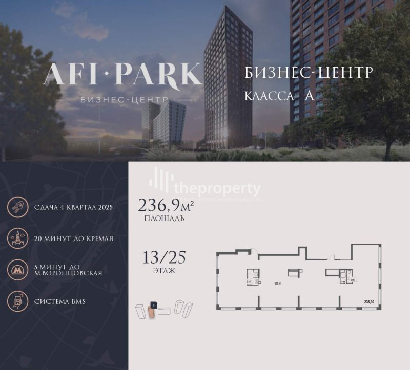 Продается просторное коммерческое помещение общей площадью 236,9 м2 на 13 этаже в строящемся бизнес-центре AFI Park. 21-этажный бизнес-центр AFI Park - современный бизнес-центр класса A с мультифункциональной экосистемой для бизнеса, панорамным остеклением и эргономичным пространством станет завершающим этапом клубного квартала. На первом этаже здания - лобби с комфортной зоной ожидания, кофе-поинтами и банкоматами, ресторан и торговая зона. Со второго этажа располагаются офисные помещения, формат которых предусматривает «нарезку» по желанию арендатора. Эргономичные openspace-планировки дают возможность организовать на каждом этаже функциональные рабочие зоны, переговорные комнаты, кабинеты руководителей, конференц-зал, бизнес-гостиные и зоны отдыха. За счет неглубокой посадки офисов и панорамного остекления все помещения хорошо освещаются естественным образом. Из окон открывается панорамный вид на город и Воронцовский парк, а высокие потолки и остекление «в пол» наполняют офисное пространство дополнительным воздухом и светом. Инфраструктура бизнес-центра создана с учетом ежедневных потребностей офисных резидентов. У входа расположена зона для посадки в такси и 11 гостевых машино-мест. В подземной части находится паркинг на 44 машино-места. На первом этаже - лобби с комфортной зоной ожидания, кофе-поинтами и банкоматами, ресторан и торговое пространство с сервисами быта. Здание оснащено централизованной системой автоматизации и управления, гарантирующей высокие стандарты контроля доступа и уровень комфорта. Принудительная приточно-вытяжная система вентиляции с подогревом и рециркуляцией воздуха, мультизональная система кондиционирования VRV, система освещения, пожарной сигнализации, управления высокоскоростными пассажирскими и грузовыми лифтами BLT, все контролируется диспетчером в автоматическом режиме через Building Management System, исключая человеческий фактор и неожиданные сбои. Круглосуточная охрана и видеонаблюдение внутри и по периметру здания позволяют эксплуатирующей компании в любое время заботиться о бизнес-центре, его резидентах и гостях, а консьерж-сервис окажет необходимые услуги по запросу резидентов в пределах здания. Стратегическое расположение между Ленинским проспектом и улицей Профсоюзной, на пересечении Старокалужского шоссе с улицей Академика Челомея обеспечивает удобную логистику на наземном транспорте, а пешая доступность станции метро БКЛ «Воронцовская» подключает локацию практически к любому району Москвы. [#7698929#]